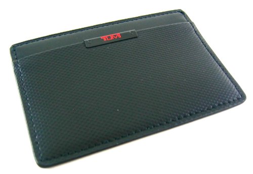 Tumi Quantum money clip card case made of 100% printed texture leather. Black Tumi logo hardware with red fill on outside pocket. Three credit card pockets and a money clip. Exterior 10.2 cm x 7.2 cm